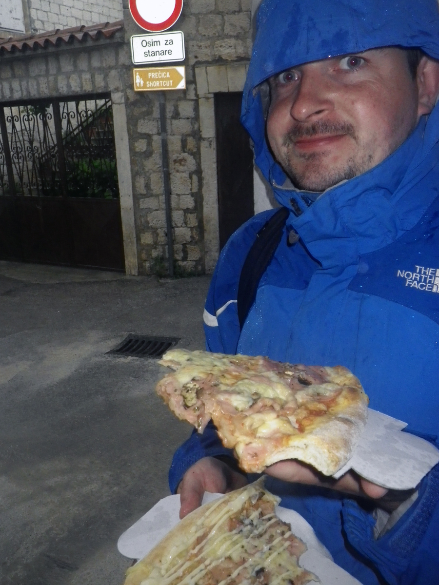 ben holding pizza in rain
