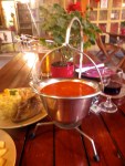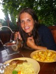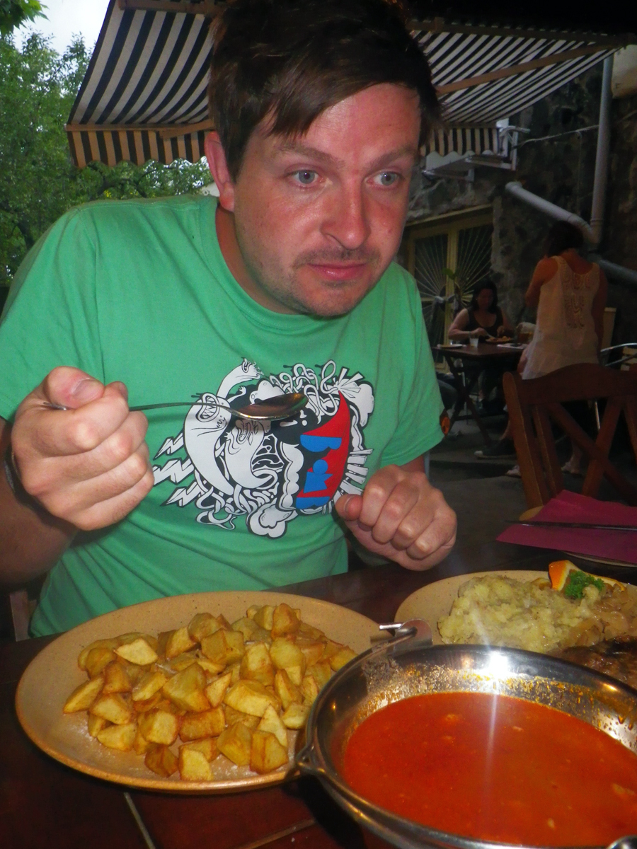 We had a few Forint left over so treated ourselves to a Hungarian dinner at the lively campsite bar. We shared a pot of goulash which arrived on a metal hanging thing…like a mini cauldron!! And duck with sauerkraut and sweet potato…ooo and some Hungarian chips-yum!